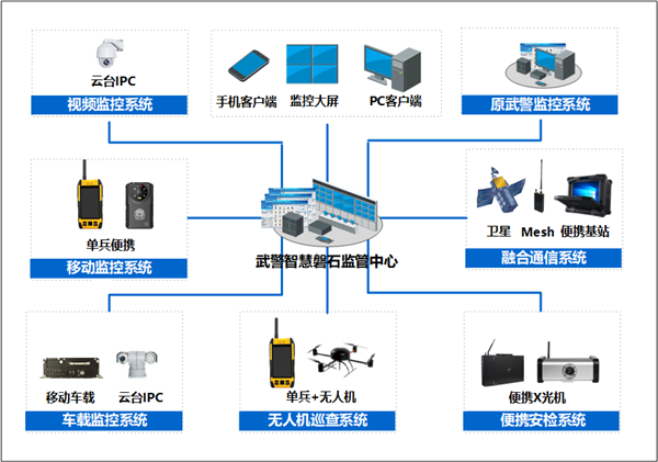 該綜合監(jiān)管系統(tǒng)各監(jiān)控中心,通過互聯(lián)鏈路、基站、衛(wèi)星等通信設施,與前端AI車載、4G單兵、高清布控球、云臺IPC、一體化手提箱、云臺攝像機等設備相互連接。從而實現(xiàn)整個系統(tǒng)信息互通,信息共享,保證武警總隊指揮監(jiān)控中心對前端武警勤務情況進行統(tǒng)一指揮、調度。